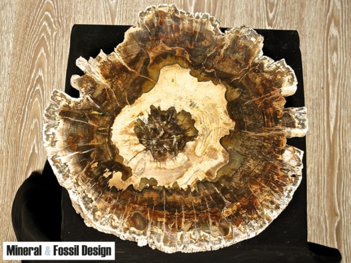 Big slice in Fossil Wood with beautiful colours. Presence of dark green, a rare colour for the Fossil Wood. The slice is almost rounded. Size 44 x 44 cm, 5 cm thick.