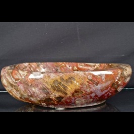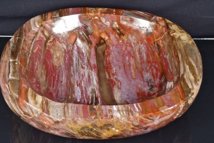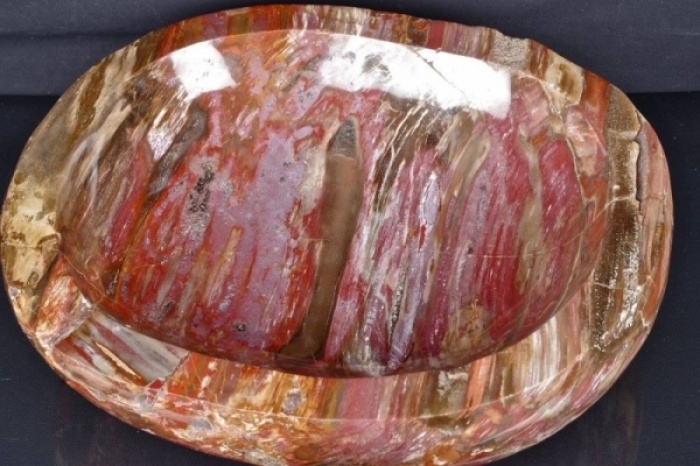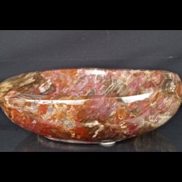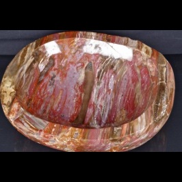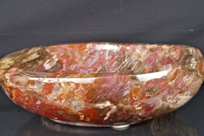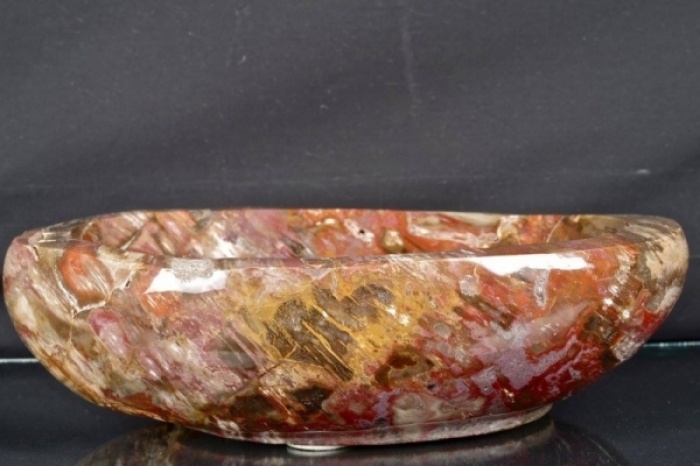 Vasca in Legno Fossile "cod. 37" con bellissime sfumature di colore dal rosa al rosso al marrone e piccole inclusioni di quarzi sulla superficie, realizzata e lucidata a mano.